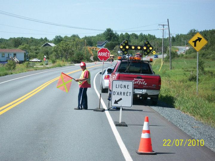 Nous disposons de véhicules de signalisation ainsi que d'une équipe de signaleurs disponible 24 heures sur 24. Nous avons l'équipement complet pour les travaux de signalisation ( panneaux de signalisation, dossards, système de communication, cônes, etc) en accord avec les normes du ministère des transports du Québec.
