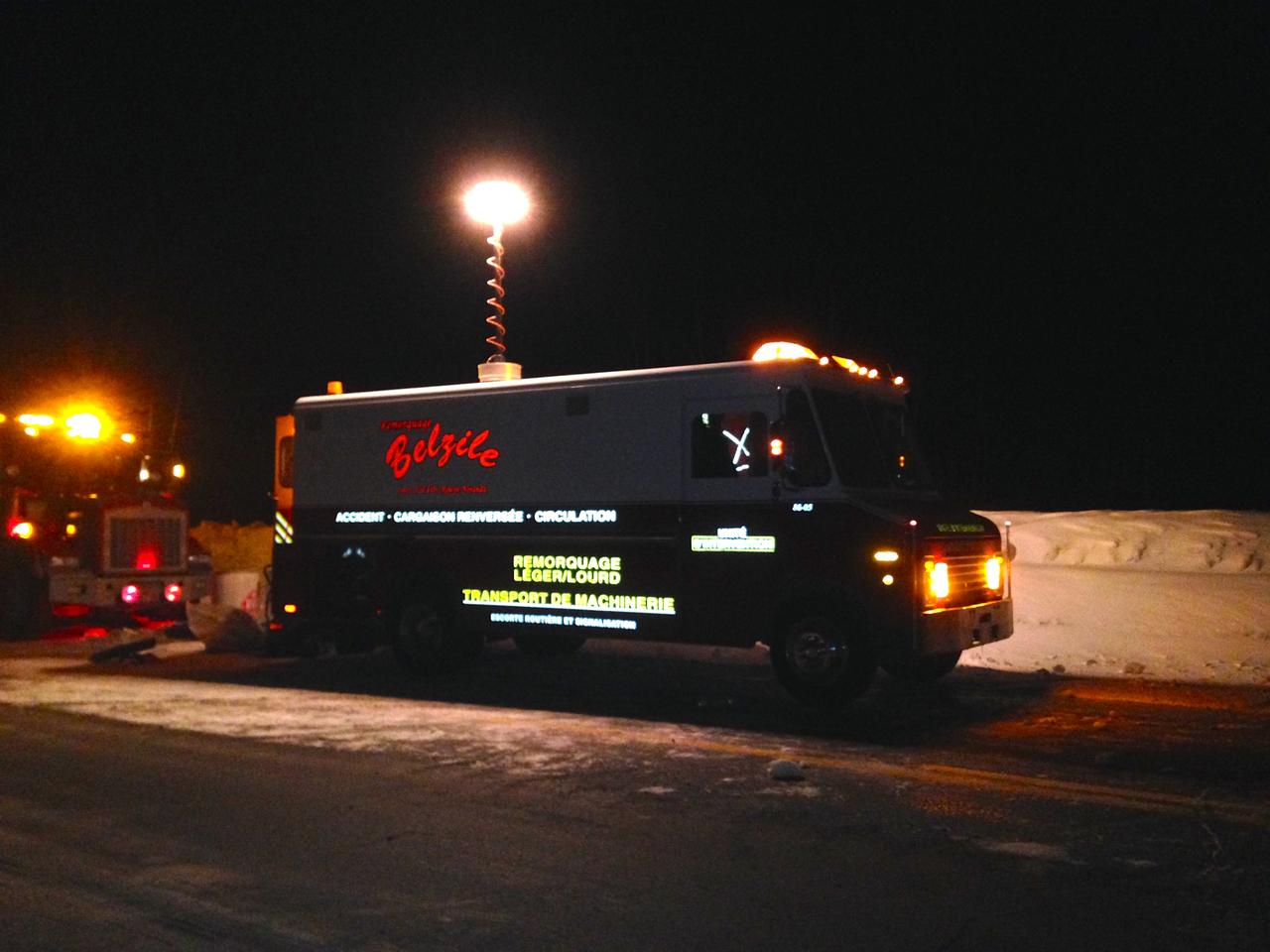 Ce camion est équipé de tout le matériel nécessaire pour les interventuons d'urgence. Il contient du matériel de recouvrement supplémentaire, de l'éclairage, tous les équipements pour vider les réservoirs de carburant sécuritairement ainsi que des outils et du matériel pour nettoyer la chaussée. Il est aussi équipé d'une tour d'éclairage. Cela nous permet de travailler plus sécuriatirement lorsqu'il fait nuit sur les lieux d'accident.